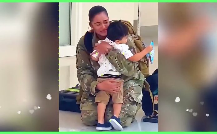 It features reunion moments when soldiers return home and are embraced by their families after deployment.